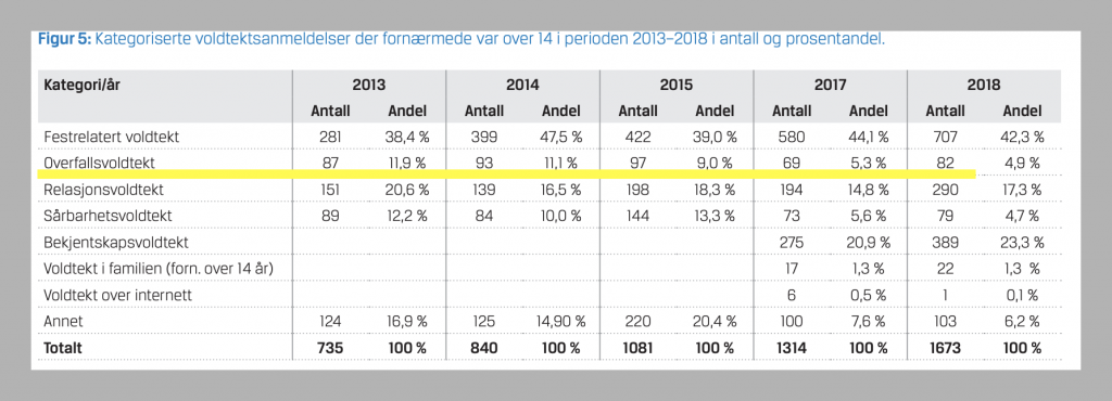 I 2018 (tall for 2019 foreligger ikke enda – selv om vi nærmer oss slutten på 2020) ble det anmeldt 82 overfallsvoldtekter – tenk så mulige mørketall. (Se faksimile fra Kripos-tabell)