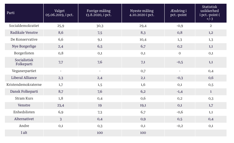 Gladest i dag er kanskje De Konservative. De går frem 1,8 prosentpoeng til 10,4 prosent. Det er partiets beste måling på mer enn 10 år, og gjør dem til Danmark tredje største parti. Ved 2019-valget fikk de 6,6 prosent.