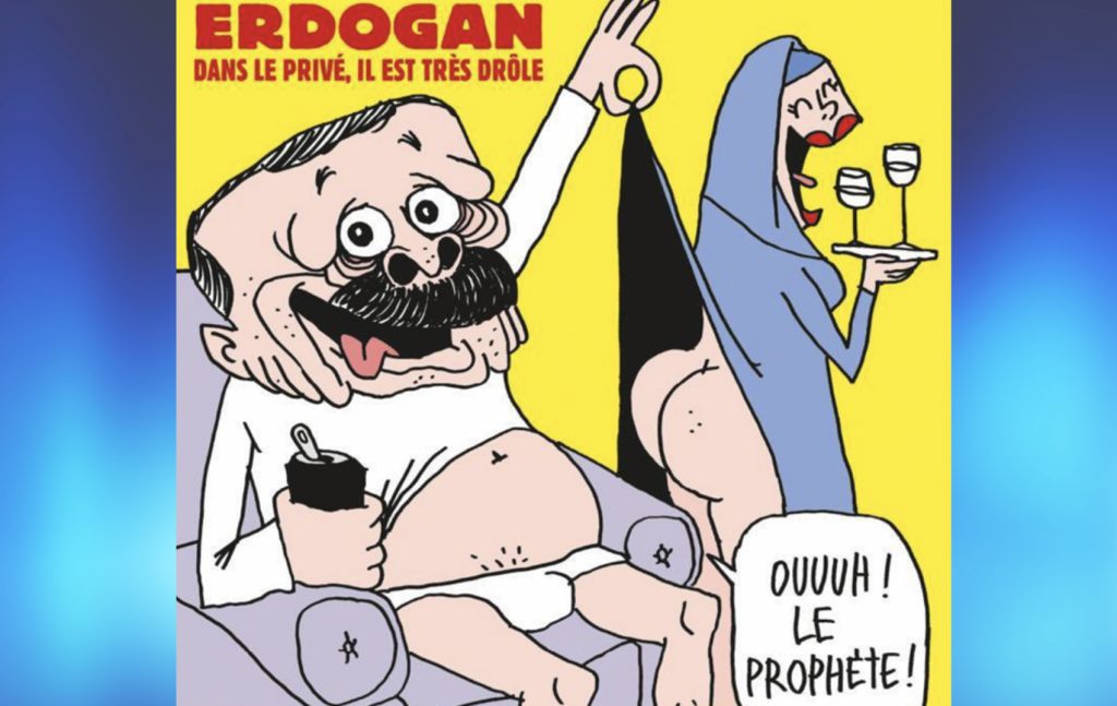 Karikaturen, som må betegnes som «snill», viser en glisende Erdogan sittende i t-skjorte og underbukse, med ølmage, og følgelig en ølboks i den ene hånda, mens den andre blotter rompa til en hijabkledd kvinne som bærer to vinglass på et serveringsfat. Alt til Erdogans «OUUUH! LE PROPHETE!»