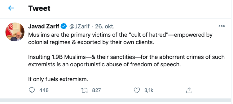 Javad Zarif hevder at det er muslimene som er de primære ofrene for «hatkulturen». Irans regime har derimot ikke oppfordret til boikott av franske varer, slik som Tyrkias president Erdogan har oppfordret til og som en rekke land har fulgt opp, for eksempel Qatar, Jordan, Saudi-Arabia og Kuwait, men retter sterk kritikk mot Macrons støtte til satiretegningene: