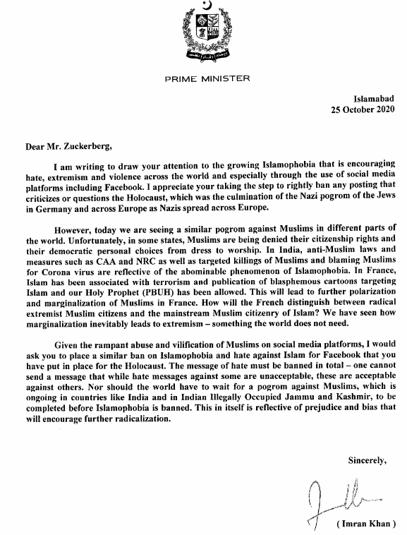Også Pakistans president, Imran Khan, kritiserer Macron for å ha «angrepet islam». Pakistan har således innkalt den franske ambassadøren for å diskutere det de anser som en «islamofobisk kampanje under dekke av ytringsfrihet». Khan har også skrevet et brev til Facebooks Mark Zuckerberg om å forby såkalt islamofobi på Facebook, på samme måte som de har forbydd fornektelse eller kritikk av Holocaust: