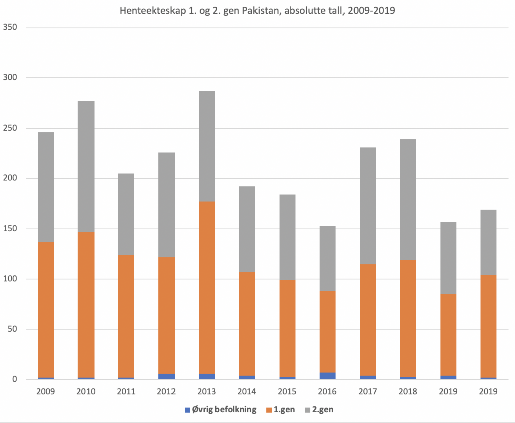 Ser vi på de ti siste år (2009-2019) er det totalt kommet 4.102 via henteekteskap. Herav totalt 45 til «øvrig befolkning» som tilsier at det ikke er til 1. eller 2.generasjon pakistaner, men vi vet ikke noe mer om hvem disse 45 er, i fjor var det 2.