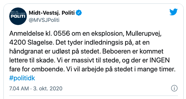 En eksplosjon på en privatadresse i byen Mullerup i Slagelse er sannsynligvis forårsaket av en håndgranat, melder politiet i Sentral- og Vest-Sjælland i en tweet lørdag morgen.