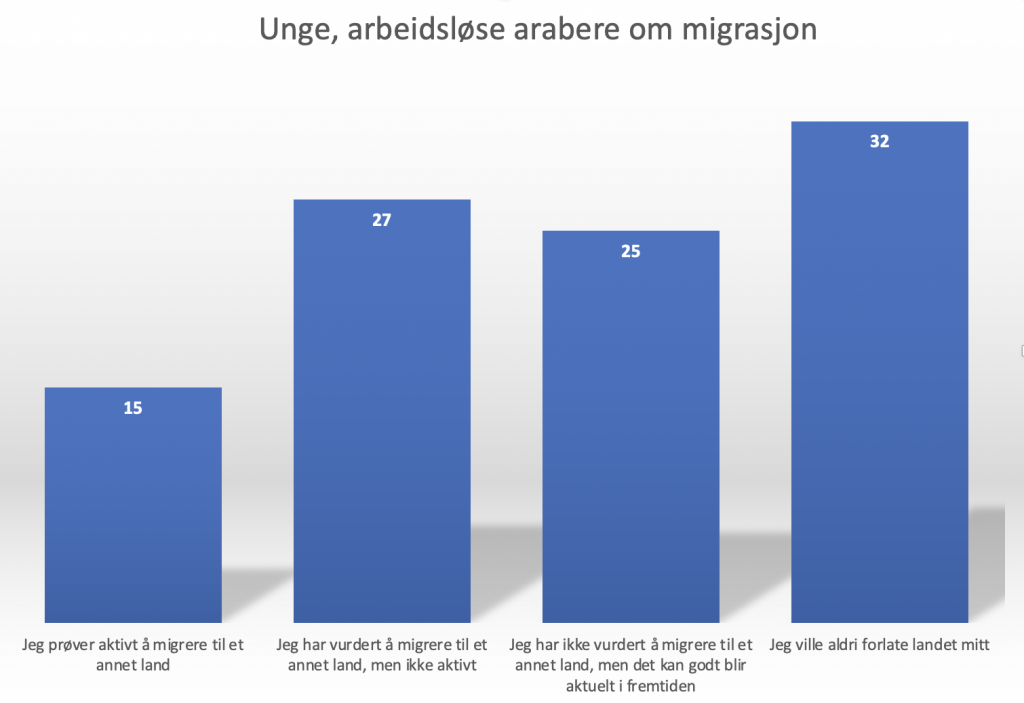 I tillegg sier 25 prosent at de ikke utelukker at det kan bli aktuelt i fremtiden. Det tilsvarer at nærmere syv av ti unge, arbeidsløse arabere er villige til å forlate eget land.