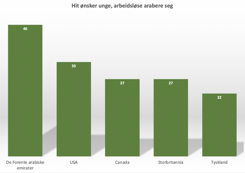I Nord-Afrika sier 47 prosent av de unge, arbeidsløse at de ønsker seg vekk. I gulflandene er andelen kun 13 prosent.