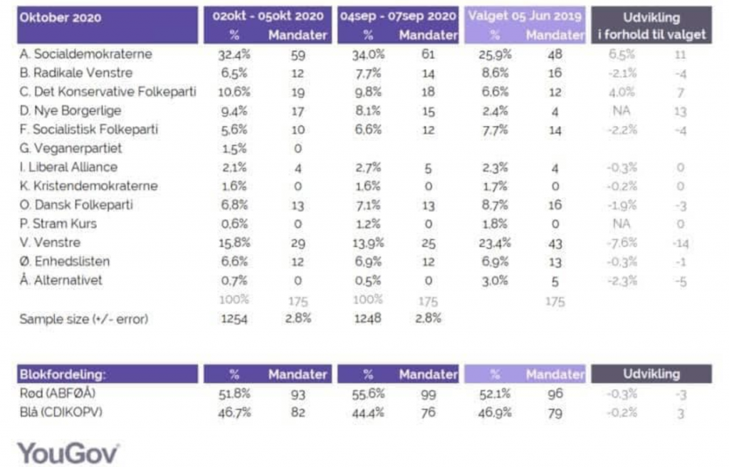 Fire av partiene i denne målingen ville heller ikke oppnådd noen plasser i Folketinget. Det gjelder Kristendemokraterna, Veganerpartiet, Alternativet og Stram Kurs.