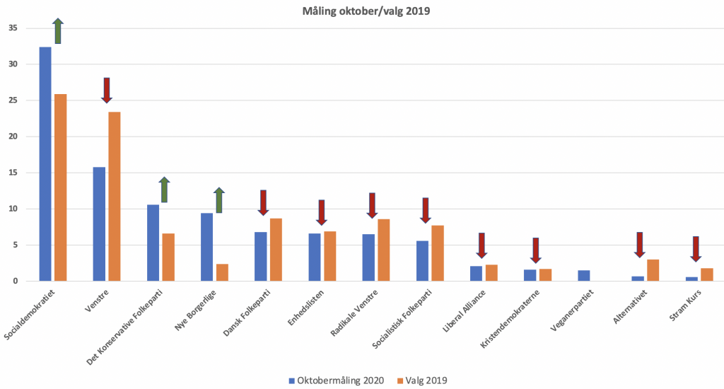 I forhold til valget er det kun tre partier som går opp, det er foruten NBs økning på på hele 7 prosentpoeng, Socialdemokratiet (opp 6,5 pp) og Det Konservative Folkepartiet (opp 4 pp). For de øvrige er det bare nedgang å spore. Mest tilbake går Venstre, fra 23,5 til 15,4 prosent. Det er en tilbakegang på hele 7,6 prosentpoeng.