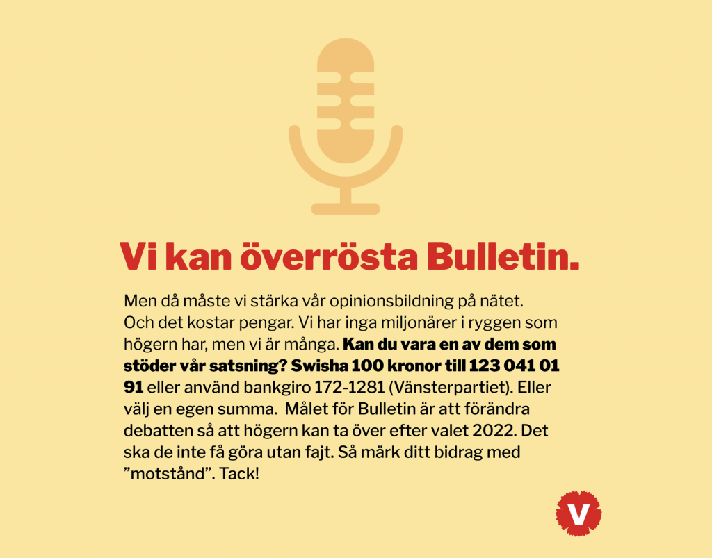 Så hva gjør så Vänstre? Jo, de tigger penger for å overdøve Bulletin. Men stakkars Vänstre har ingen rike onkler: «Vi har ingen millionærer i ryggen som høyresiden har, men vi er mange», fastslår partiet.
