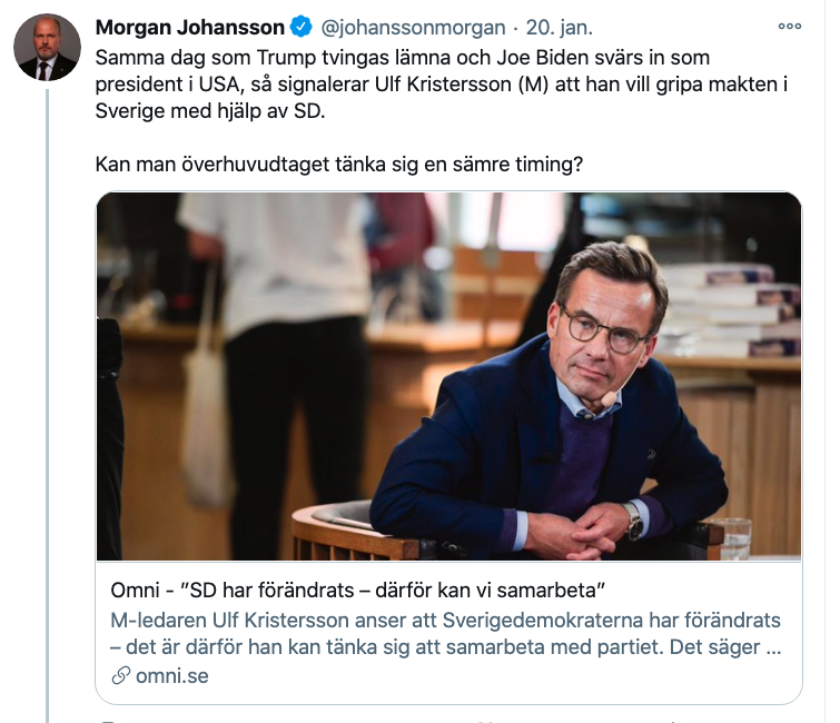 Så ble det jo ikke en borgerlig regjering i 2018, men kaoset var såpass komplett at det tok svært lang tid før en regjering kom på plass. Socialdemokraterna og Miljöpartiet trakk til slutt det lengste strået, men kun fordi Liberalerna og Centerpartiet byttet side. De to sistnevnte gikk nemlig til valg på et borgerlig samarbeid, men endte opp som støttepartier til en S-ledet regjering (i det som omtales som «januaravtalen»). Tilbake satt en slukøret Ulf Kristersson.