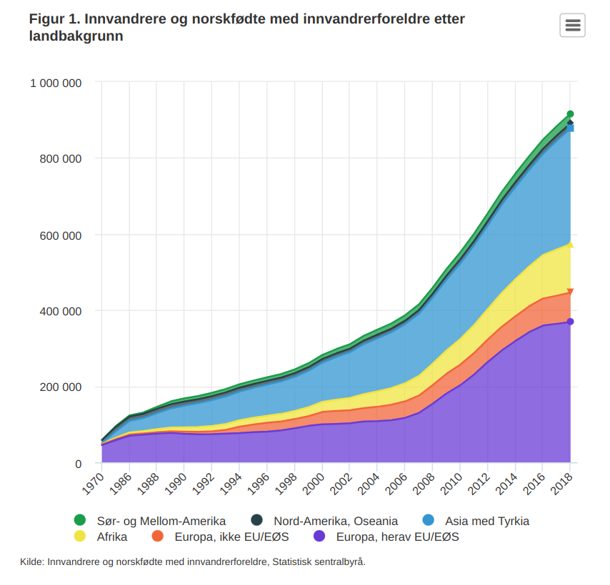Ser man på SSBs tall over innvandrere og norskfødte med innvandrerbakgrunn, viser tallene en stadig økning, der antallet innvandrere med bakgrunn fra Asia og Afrika til sammen utgjør omtrent like mange som andelen innvandrere og norskfødte med innvandringsbakgrunn fra Europa.