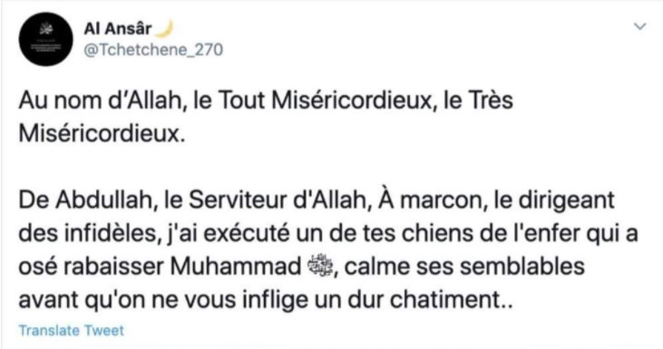 Meldingen som ble lagt ut av drapsmannen på Twitter i etterkant av halshuggingen av den franske læreren Samuel Paty lød: