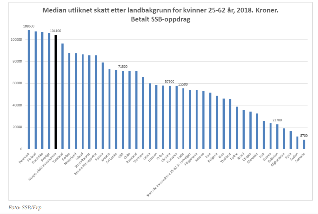 Median innbetalt skatt for kvinner fra Syria er knapt over den for somaliske kvinner, de ligger helt i bunnen av statistikken. Samtidig er innvandrere fra visse deler av verden overrepresentert på offentlige overføringer.