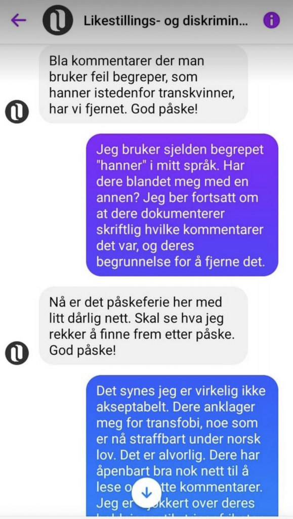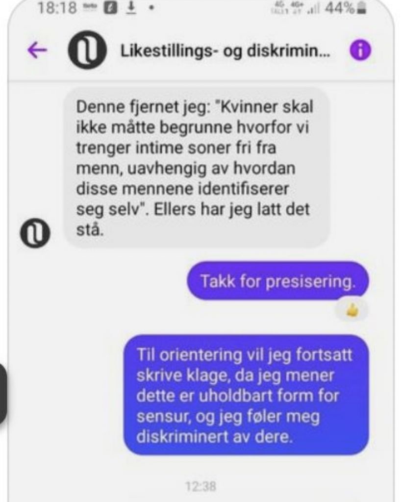 Forleden ble jeg kontaktet av kvinnen som hadde skrevet dette. Hun fikk melding fra LDO via Messenger om at ytringen hennes framstod som transfobisk, og at LDO derfor fjernet den. Kvinnen har klaget. Det er bra. Et statlig ombud kan ikke forvalte ansvaret for ytringsfriheten uten kunnskap om hva de holder på med.