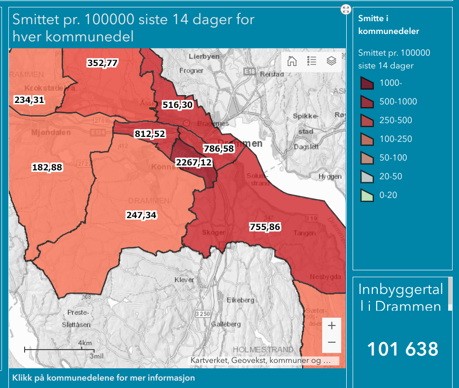 For å ta smittetallene først som sist; på det som omtales som bydelene Danvik, Austad og Fjell ligger smitteforekomsten på hele 2.267 per 100.000. Til sammenlikning er smittetallet i den tilstøtende bydelen Konnerud og Skoger kun en tidel, og innvandrerandelen i respektive bydeler korrelerer direkte med smittetallene. På Drammen Kommunes nettsider finner vi oppdaterte smittetall.