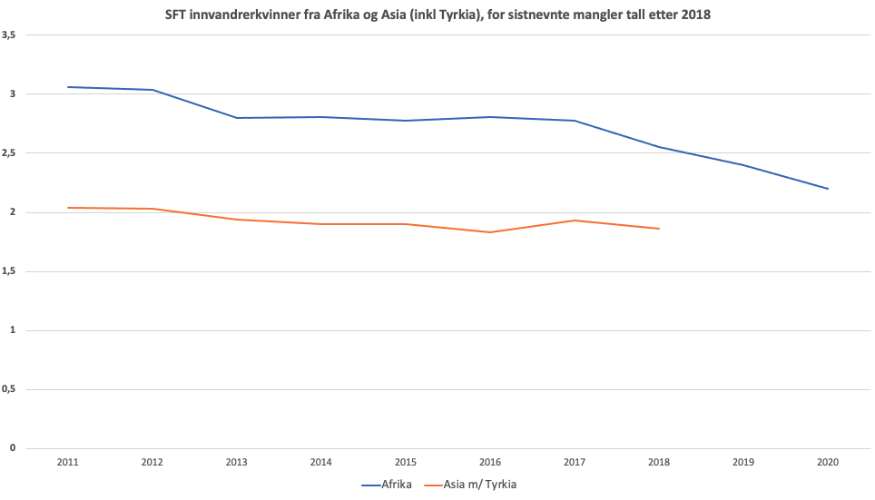 Tidligere publikasjoner fra SSB har avdekket at afrikanske kvinners SFT i Norge var på 3,06 i 2011, der nedgangen har vært mest markant etter 2017. For kvinner fra Asia, inkludert Tyrkia, er SFT mer stabilt, men her mangler vi tall etter 2018.