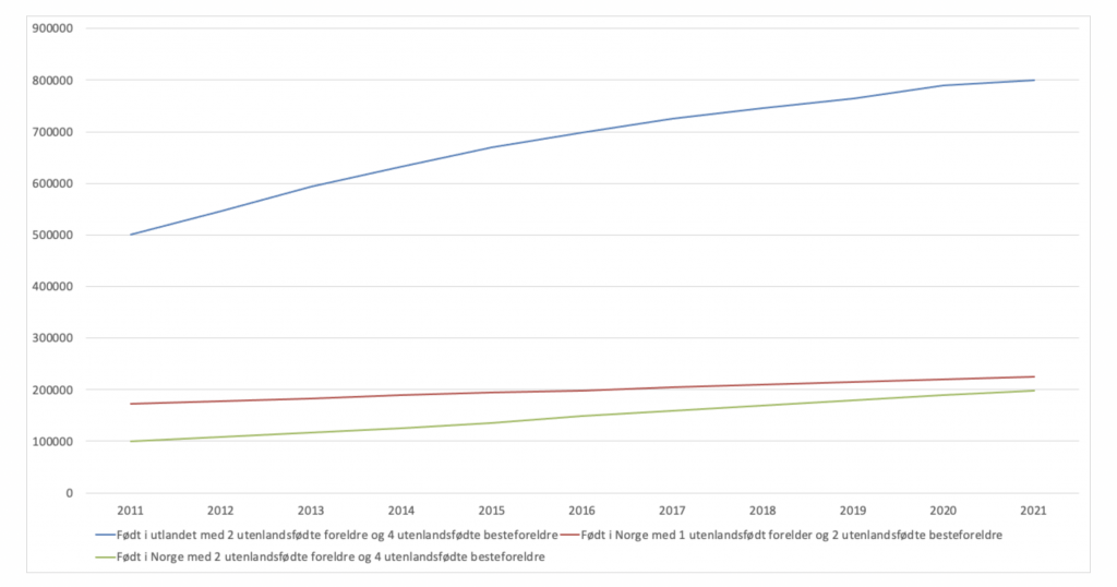Siden 2011 har befolkningen i alt økt med 471.064 personer. Innvandrergruppen økt med i underkant av 300.000 personer (299.594), barn av etnisk norsk med innvandrerpartner har i samme periode økt med 51.740, mens andregenerasjon har økt med 97.426 personer. (Kilde: SSB)