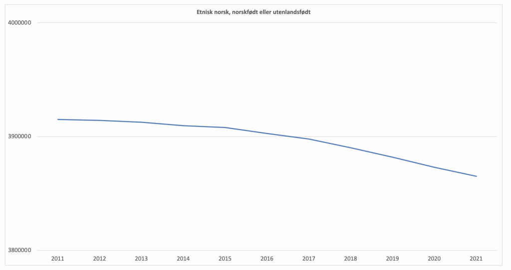 Den etnisk norske befolkningen, altså norskfødte eller utenlandsfødte med to norskfødte foreldre med fire norskfødte besteforeldre, har i samme periode hatt en nedgang på i underkant av 50.000 personer (-49.935). (Kilde: SSB)
