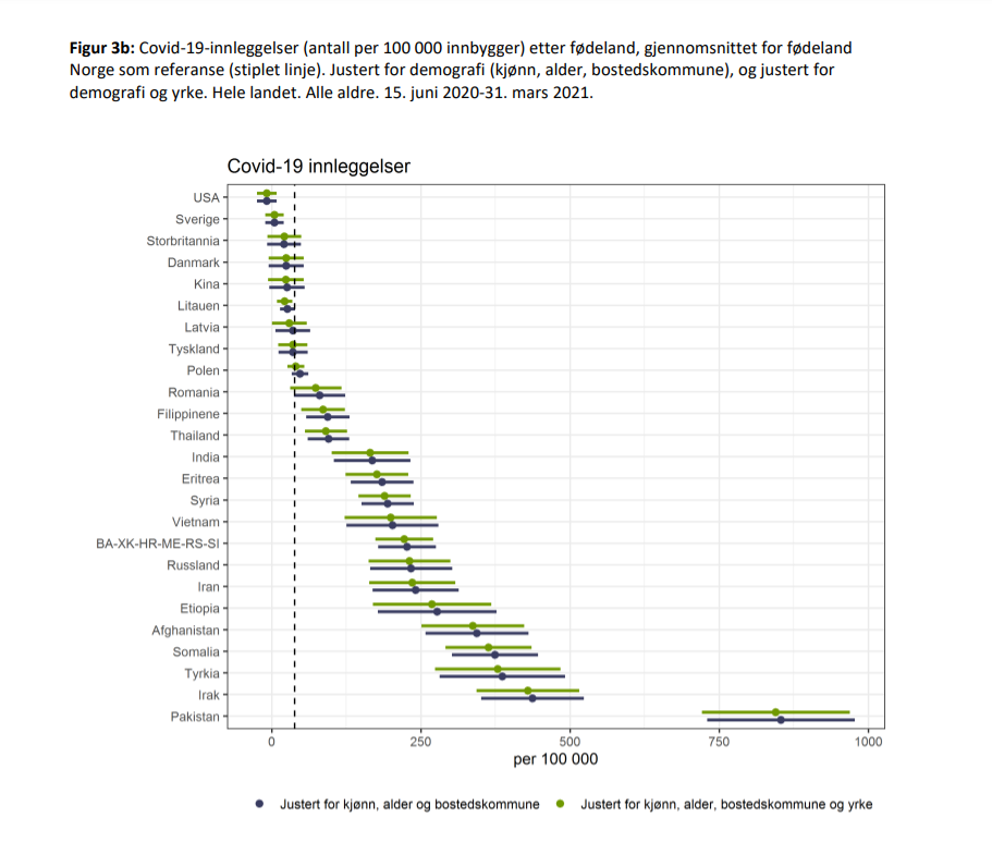 Imidlertid tyder ikke våre funn på noen mønstre som tilsier at gener spiller en stor rolle for forskjellene vi observerer mellom personer med ulik landbakgrunn. Vi finner for eksempel at personer fra naboland i Sør-Asia har stor forskjell i forekomst av både smitte og innleggelser (Pakistan versus India). Funn fra Storbritannia reflekterer også dette og støtter heller ikke en genetisk forklaring på ulikheter etter etnisitet eller landbakgrunn (HM Government 2021).