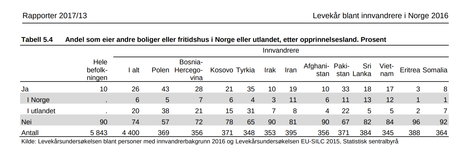 Den nevnte undersøkelsen av SSB er en levekårsundersøkelse blant innvandrere i Norge. I undersøkelsen skriver SSB at de har kartlagt hvor mange som eier en sekundærbolig, enten i Norge eller i hjemlandet. Det har de gjort fordi det gir en «indikasjon på at man har bånd til land utenfor Norge». Båndene til hjemlandene er spesielt sterke for muslimske innvandrere, skal vi tro SSBs tallmateriale. For mens bare 10 prosent av Norges befolkning eier en hytte eller annen bolig, er tallene langt høyere for innvandrere fra muslimske land.