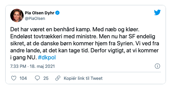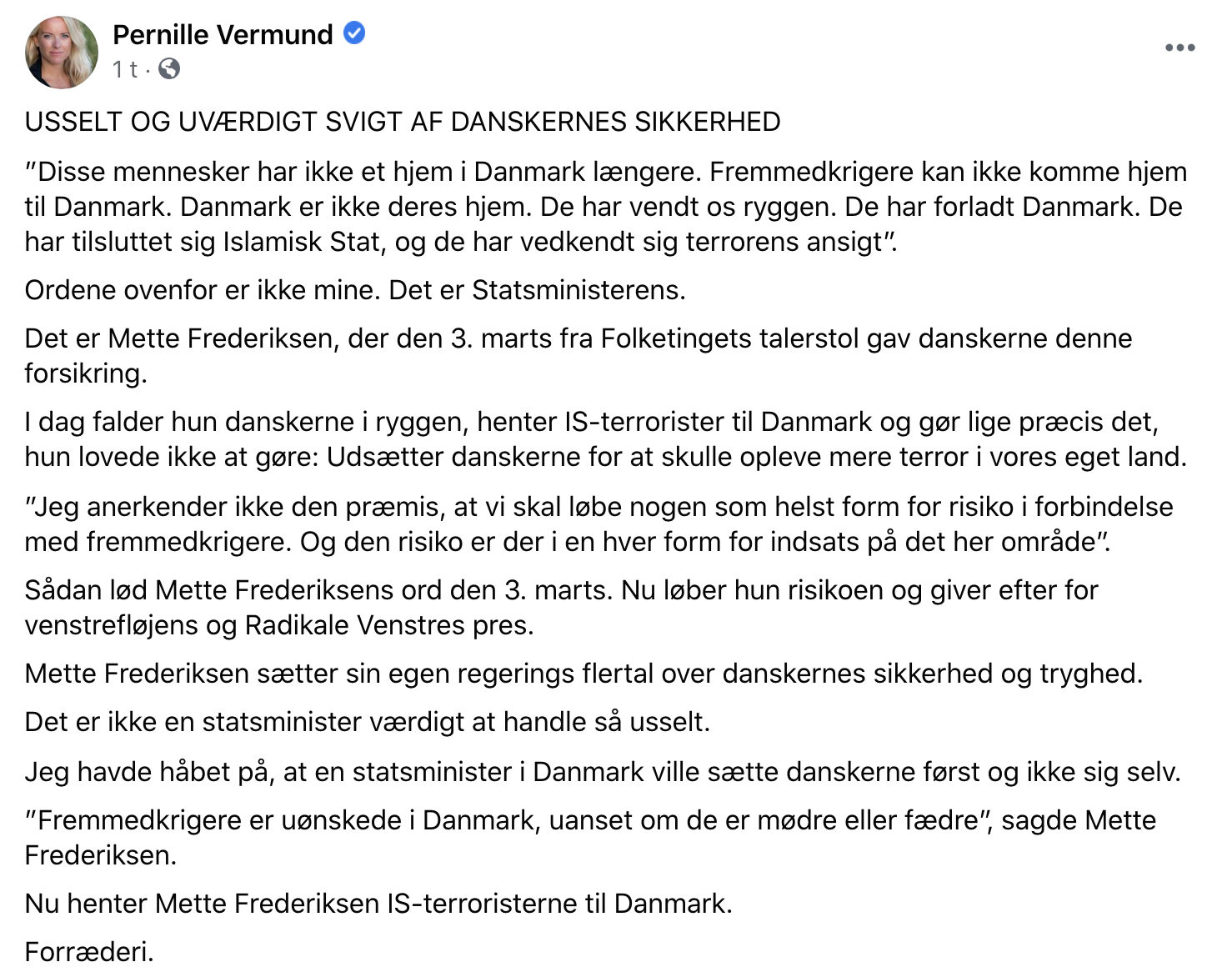 Den danske sosialdemokratiske regjeringen – med statsminister Mette Frederiksen i spissen – har over lang tid hardnakket hevdet at personer som har erklært sin sympati til IS ikke skulle få komme tilbake til Danmark. Det inkluderer både IS-kvinner og deres barn, selv om regjeringen har gitt en viss åpning for eventuelt å hente barna. Men som kjent vil ikke IS-mødrene akseptere at de ikke får bli med.