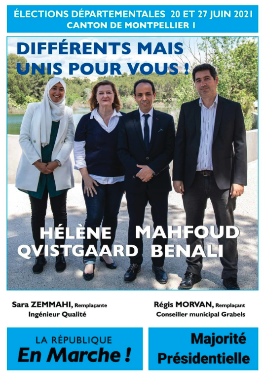 Sara Zemmahi er ingen kjent politiker i Frankrike, eller rettere sagt: hun var en ukjent politiker i et fransk lokalvalg. Men en valgkamp-plakat ble fanget opp av nestlederen for Rassemblement national (partiet til Marine Le Pen), som også antas å bli president Emmanuel Macrons parti, La République en Marche (LREM), hovedmotstander frem til neste års valg.