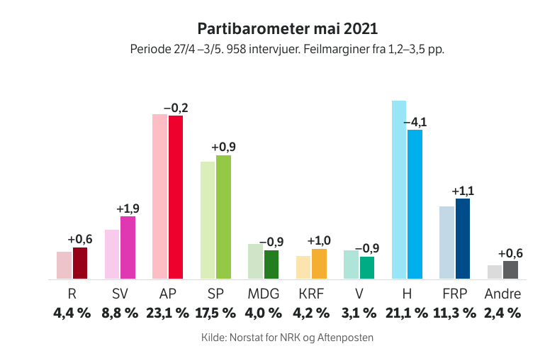 Ei heller på den meningsmålingen som kom på tampen av gårsdagen, selv om den viser at Ap er landets største parti. Men det er de bare fordi Høyre får et kraftig fall på over 4 prosentpoeng. Ap står omtrent på stedet hvil (nedgang på 0,2), mens FrP har en liten fremgang (1,1).