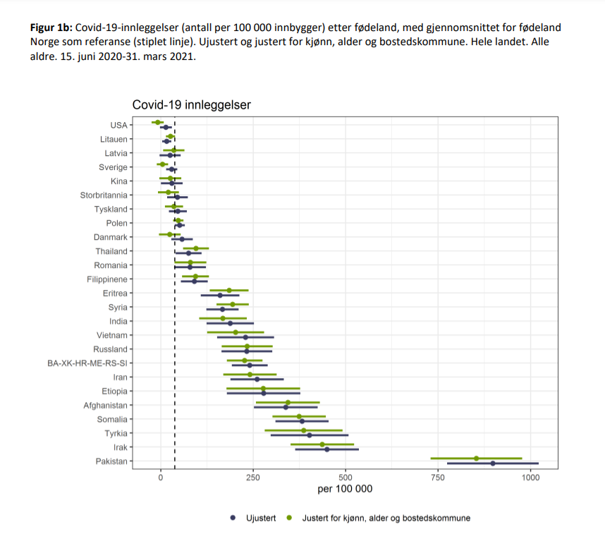 Imidlertid tyder ikke våre funn på noen mønstre som tilsier at gener spiller en stor rolle for forskjellene vi observerer mellom personer med ulik landbakgrunn. Vi finner for eksempel at personer fra naboland i Sør-Asia har stor forskjell i forekomst av både smitte og innleggelser (Pakistan versus India). Funn fra Storbritannia reflekterer også dette og støtter heller ikke en genetisk forklaring på ulikheter etter etnisitet eller landbakgrunn (HM Government 2021).