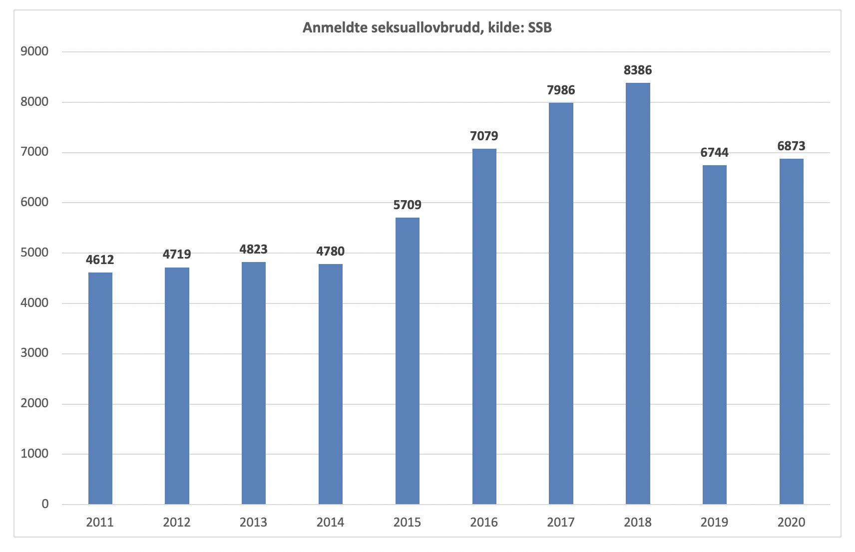 Seksuallovbrudd lå på 1,3 per 1.000 innbygger både i 2019 og 2020. Men går vi på antall hendelser for seksuallovbrudd ser bildet slik ut: