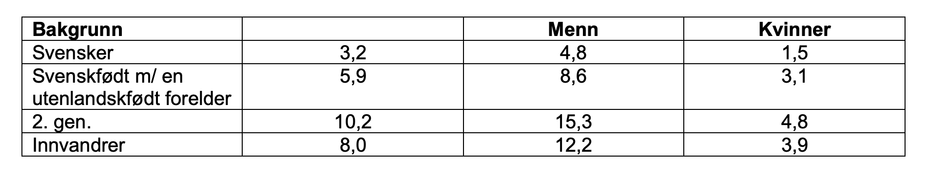 Merk at «svensk bakgrunn» i denne sammenheng betyr at du er født i Sverige av svenskfødte foreldre, mens «innvandrerbakgrunn» er tredelt: