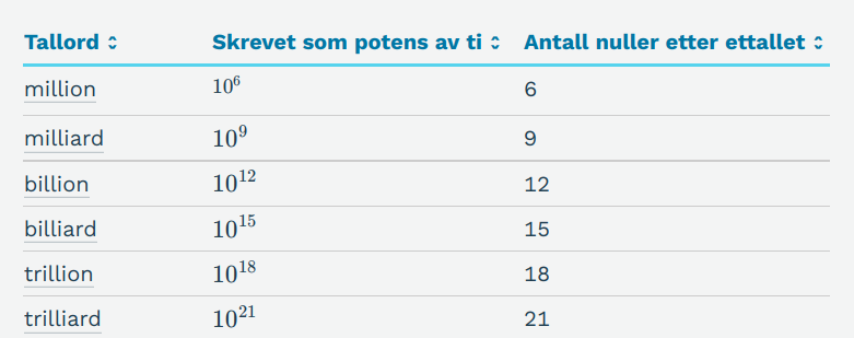 Dersom man i store trekk skal forklare hvordan man omprioriterer store summer, bør man være grunnleggende kjent med forskjellen på disse store tallene man gjerne kan uttrykke med et titall med et potenstall. Potenstallet angir enkelt sagt antall nuller bak ettallet, her fra SNL, som forøvrig har angitt potenstallet helt opp til googolplex, om noen skulle være interessert.