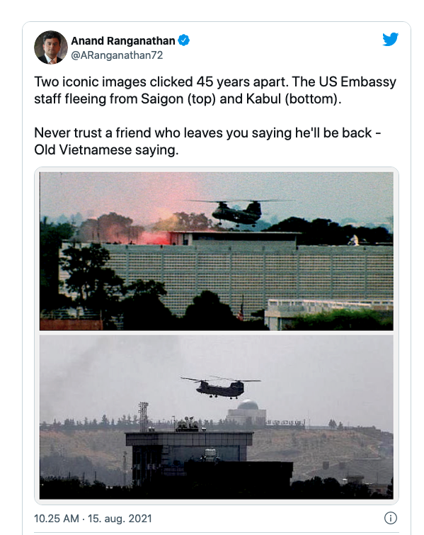 Én ting er en ydmyket Joe Biden. På en pressekonferanse for rundt en måneds tid siden (8. juli), som det finnes tallrike opptak av selv om den da ikke vakte noe oppsikt, lovet en selvsikker Biden at krigen i Afghanistan aldri ville ende like så katastrofalt som den i Saigon i Vietnam, hvor amerikanske helikoptre landet på takene for å få folk ut innen nordvietnamesiske soldater inntok ambassaden.