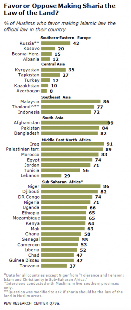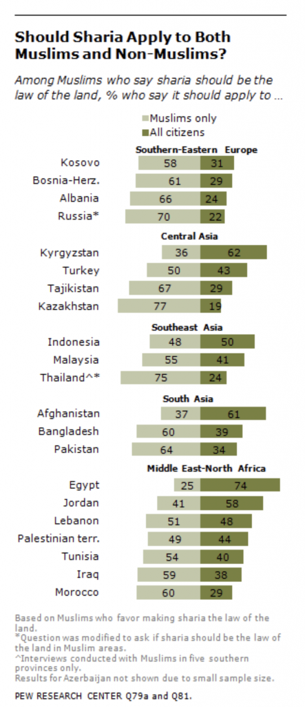 I Afghanistan mener imidlertid 61 prosent at ikke-muslimer også skal følge islamsk lov (samme lenke som over).