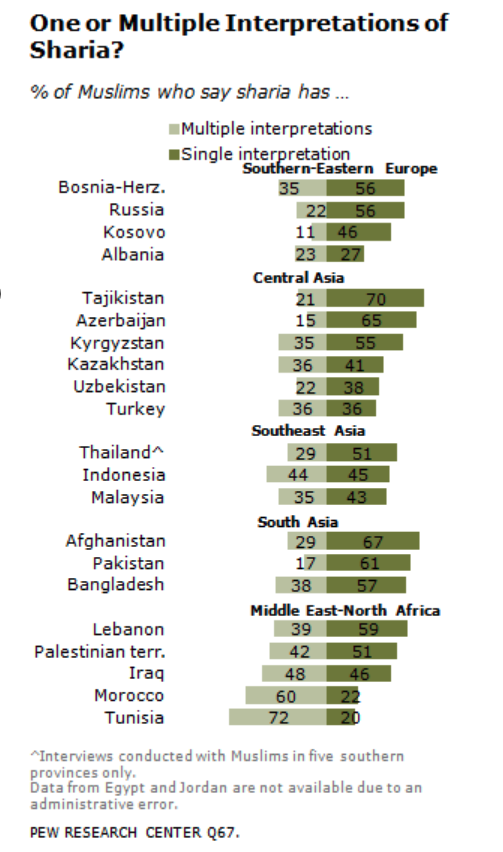 Dessuten har muslimer over hele verden forskjellige oppfatninger av hva sharia betyr i praksis, sier Pew. Men i landene som ble undersøkt i Sør-Asia, sier majoritetene konsekvent at det bare er én mulig måte å forstå sharia på. Andelen som har denne oppfatningen varierer fra 67 prosent i Afghanistan til 57 prosent i Bangladesh.