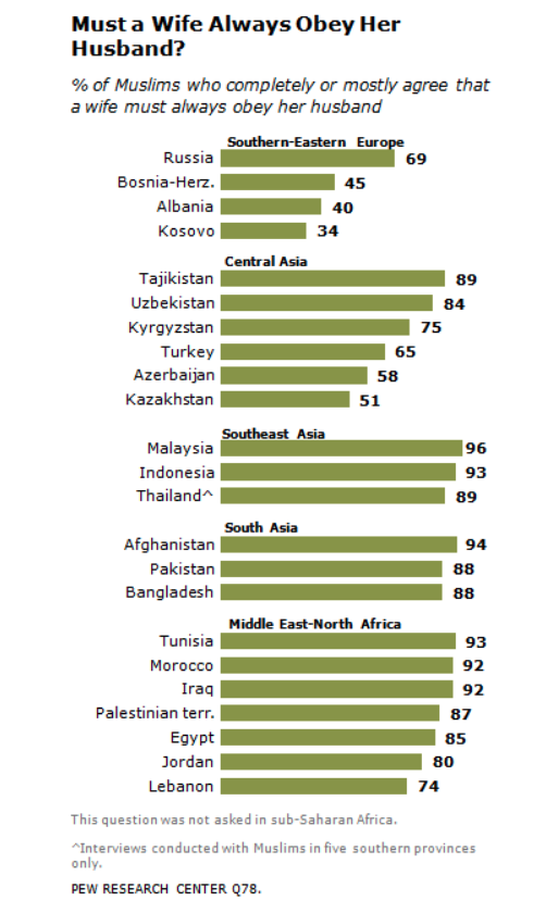 I de fleste landene er flertallet av muslimske kvinner så vel som menn enige om at en kone alltid er pliktig til å adlyde mannen sin. Dette gjelder for 94 prosent i Afghanistan. Her er de kun slått av Malaysia der 96 prosent sier det samme.