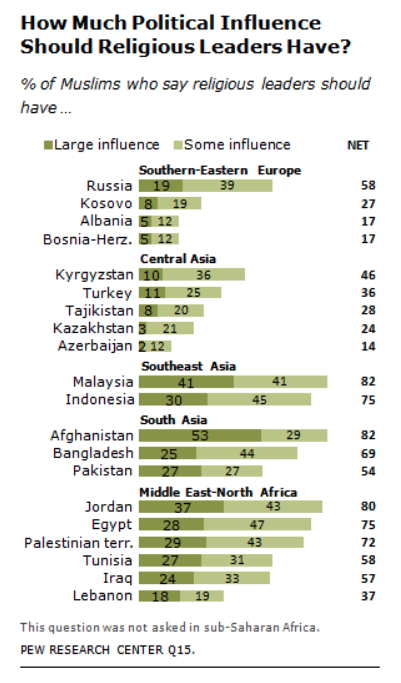 Så er spørsmålet hva som skal være religiøse lederes rolle i politikken. Også her troner Afghanistan på topp, der 82 prosent mener de skal ha en rolle i politikken. Av disse mener 53 prosent «stor innflytelse», mens 41 prosent sier «noe innflytelse».