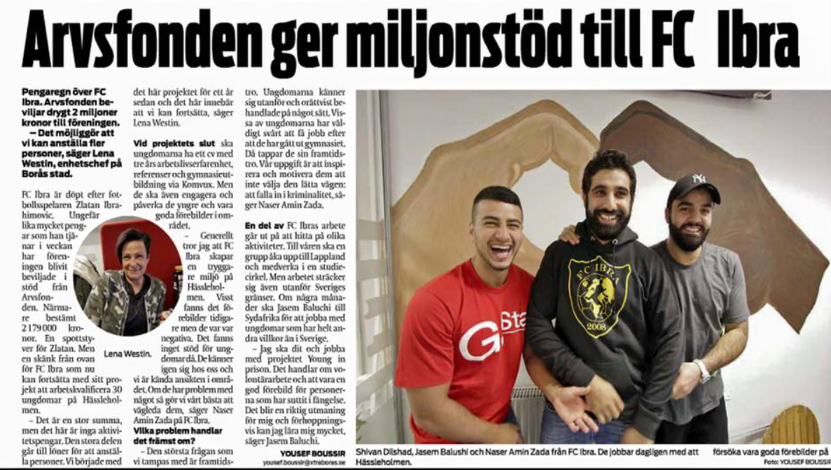 Selv det statlige fondet Allmänna arvsfonden utbetalte millioner til prosjektet. Ikke rart de «gode forbildene» gliser sine aller bredeste smil i denne faksimilen fra Borås Xtras avis, gjengitt på FC Ibras egen facebookside.