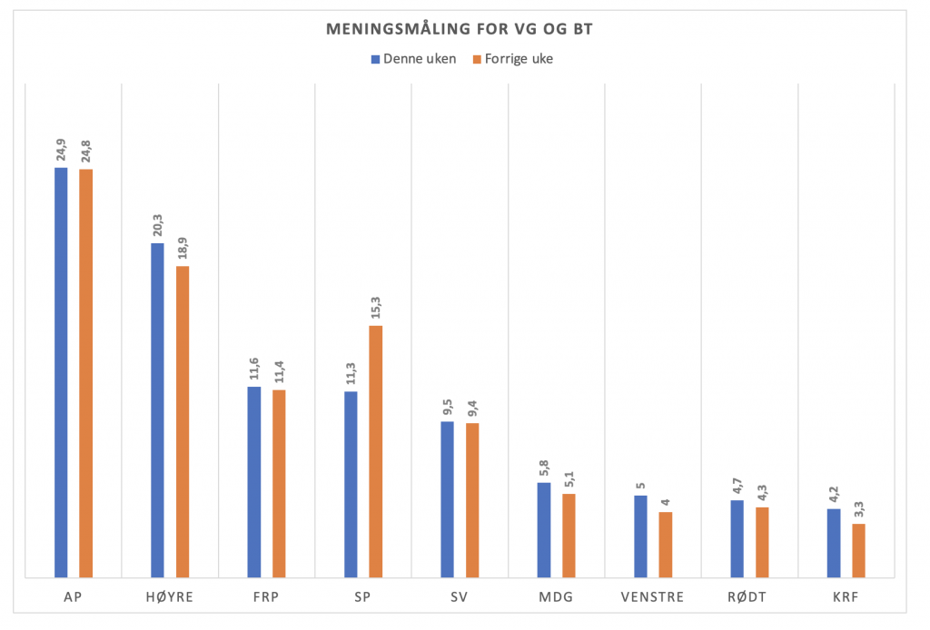 I en ny meningsmåling, utført av Respons analyse for VG og BT, gjør Senterpartiet det svært dårlig ut fra hvordan de har ligget an tidligere. De raser nedover med 4 prosentpoeng og ender på 11,3 prosent. Det gjør Sp til landets fjerde største part, da FrP holder stand og ligger på 11,6 prosent.
