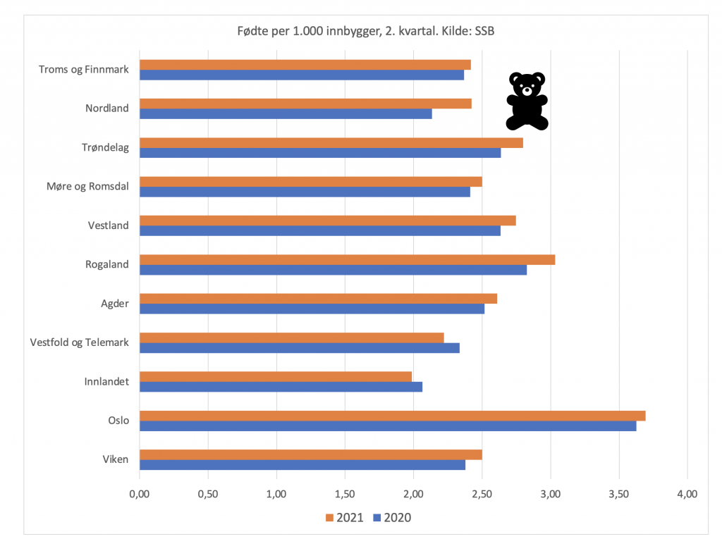Det ble født flest barn i Oslo (3,69 mot 3,63 per 1.000 innbygger i fjor), men økningen var størst i Nordland (2,42 mot 2,13). Nedgangen var størst i Vestfold og Telemark (2,22 mot 2,34).