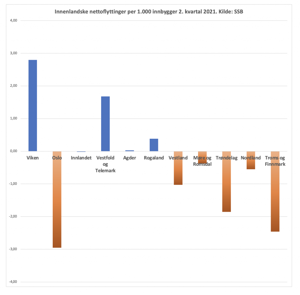 Det var Oslo som hadde det største flyttetapet i absolutte tall. Og mange flytter fra vår hovedstad. SSB påpeker at flyttestrømmene er store, med 9.600 innenlandske utflyttinger og 7.500 innflyttinger. Dette er det høyeste SSB har målt i 2. kvartal så lenge de har ført kvartalsvis flyttestatistikk. Vi ender med et innenlandsk flytteunderskudd på over 2.000 personer.
