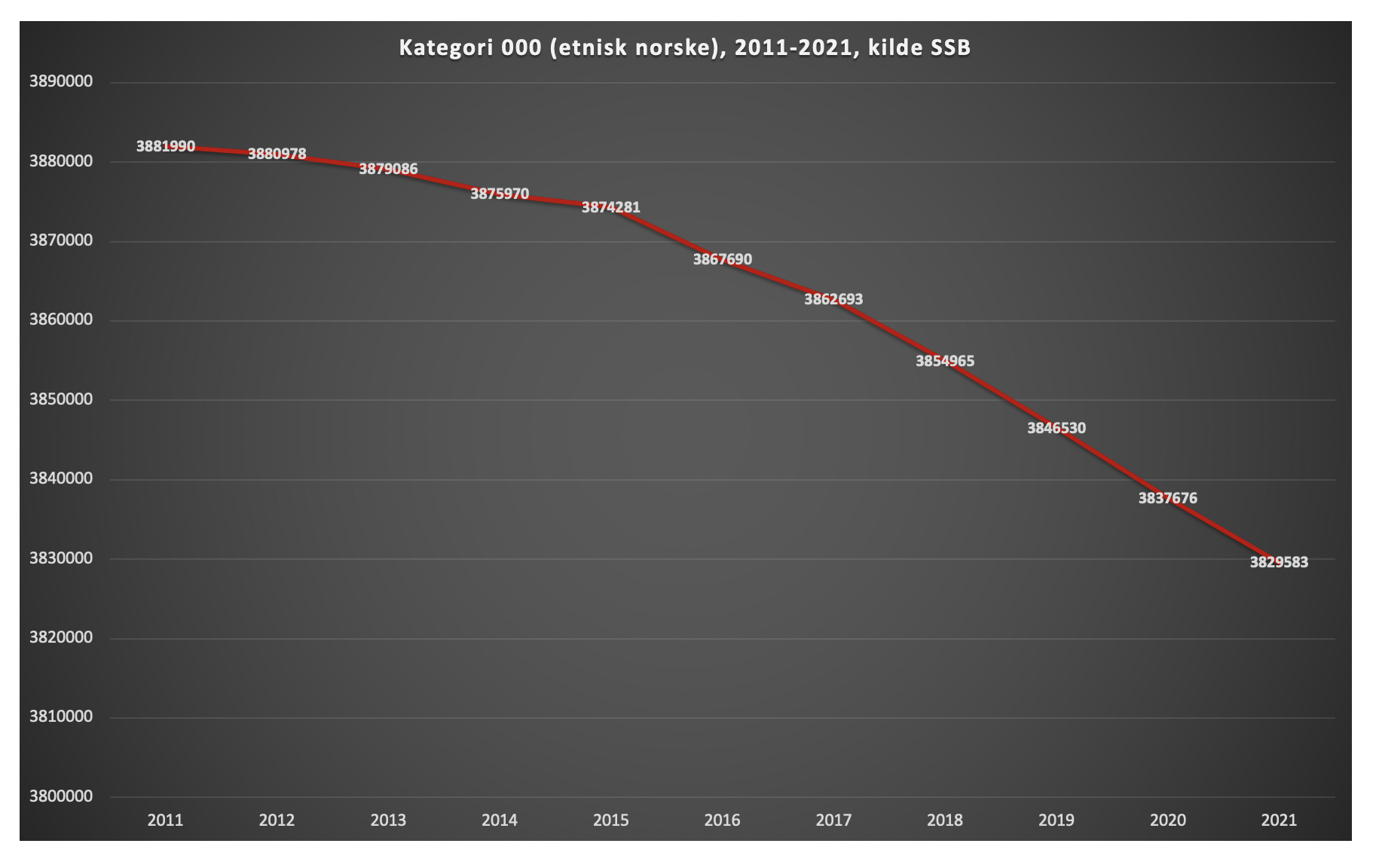 Etnisk norske er i denne sammenheng et statistisk uttrykk for at man er født i Norge av norskfødte foreldre og alle besteforeldrene er norskfødte (000). I 2011 var det i kategorien 000 registrert 3,881.990 mot 3,829.583 i 2021. Det betyr at vi i denne perioden er blitt 52.407 færre etnisk norske. Nedgangen er neppe særlig overraskende for dem som kjenner fruktbarhetstallene, da vi som kjent stadig får færre barn (selv om de ble født noen flere i 2. kvartal i år – hvis det holder året ut, vil vi få første økning i samlet fruktbarhetstall på 12 år).