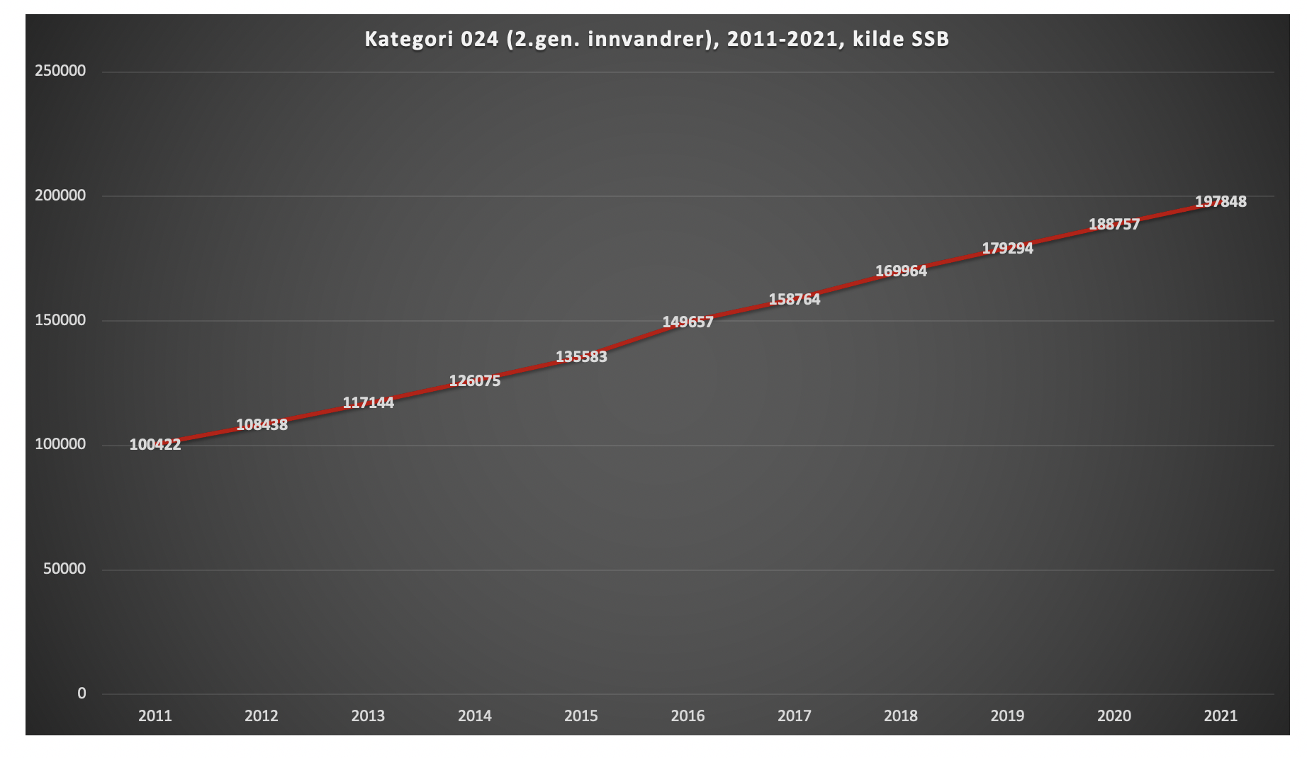 Ser vi på gruppen der en er født i utlandet og hvor også en av foreldrene er utenlandskfødt og samtlige fire besteforeldre er utenlandskfødt (114), er den litt større, men fortsatt beskjeden. Fra 237 i 2011 til 560 i 2021. Denne gruppen må sammenlignes med 014, og som nevnt lå den på 11.832 i 2021.