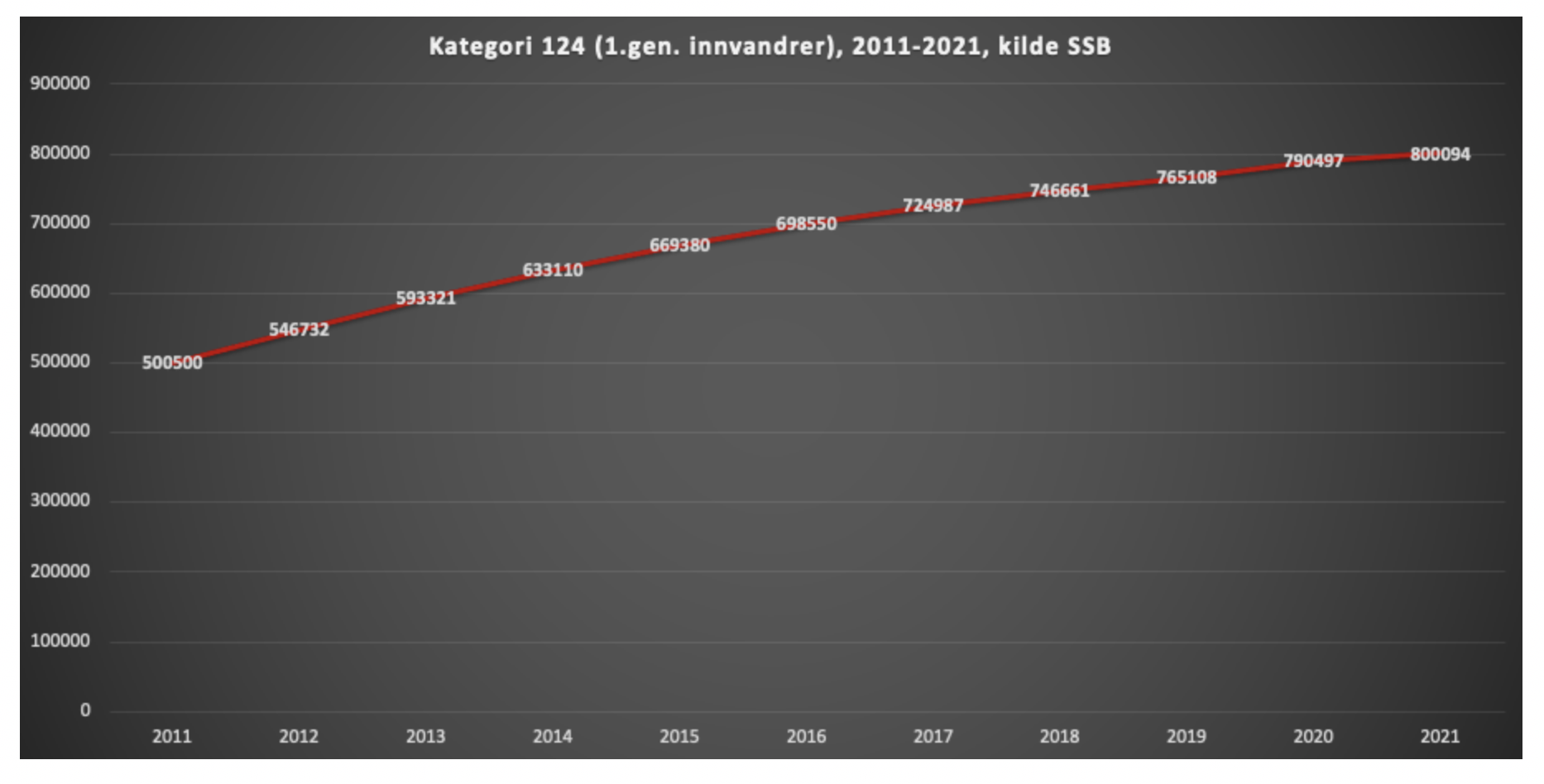 For om vi er blitt færre etnisk norske, så har befolkningen i samme periode økt fra 4,920.305 i 2011 til 5,391.369 personer i 2021. Denne økningen skyldes ikke minst innvandringen (124). I 2011 var det 500.500 innvandrere, i 2021 var det 800.094, altså 299.594 flere. Det er en økning på 60 prosent fra 2011.