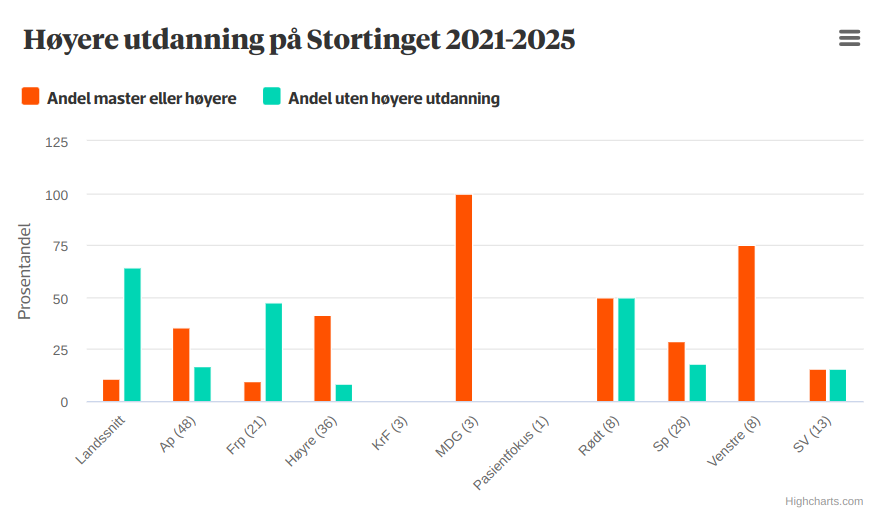 Men Arbeiderpartiet er ikke alene om å ha mange akademikere i stortingssalen. Det er gjennomgående for alle andre partier enn Frp. Khrono viser til denne grafen: