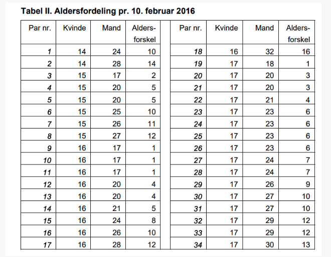 For ikke å miste av synet hva saken bunner i, minner vi om at det var snakk 34 par med barnebruder. Aldersforskjellen var fra ett (tre par) til 16 år (ett par) på brud og brudgom. De yngste brudene var 14 år (to jenter) og de eldste 17 år (16 jenter). Brudgommens alder spente fra 17 (fire gutter) til 32 år (en mann).