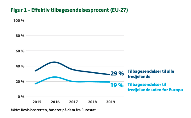 Ifølge rapporten har det siden 2008 i gjennomsnitt vært utvist rundt 500.000 illegale migranter årlig fra medlemslandene i EU. Av disse har kun en tredjedel (29 %) faktisk reist tilbake til et tredjeland.