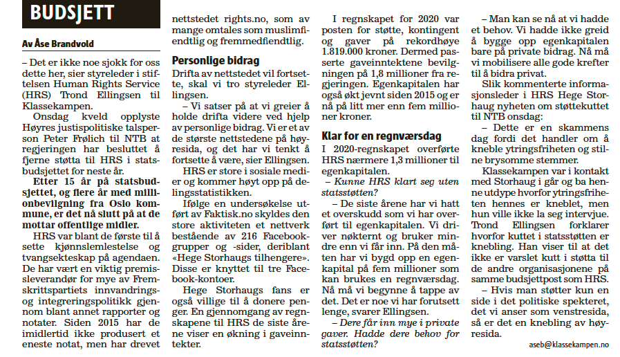 Vår styreleder Trond Ellingsen svarer som sant er at HRS drives nøkternt. Selvsagt gjør vi det, siden vår statsstøtte er et tilbakevendende tema ved hvert nasjonal- og revidert budsjett. Vi har i årevis vært nødt til å være beredt på at støtten kunne bli tatt fra oss. Og hvem er det så som har vært mest opptatt av denne støtten? Jo, gammelmediene, spesielt Klassekampen, og partiet Rødt.