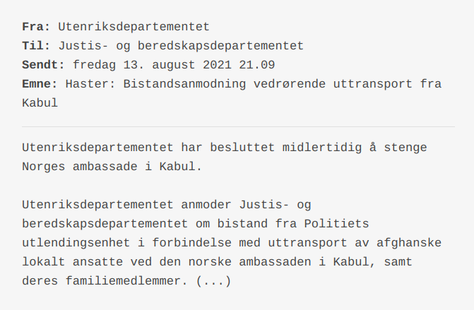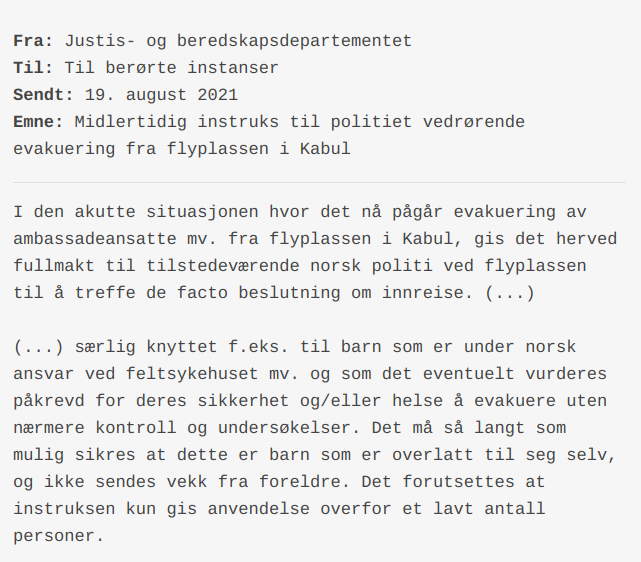 Er det troverdig at foreldrene til barna, som opplyses å ha vært innlagt på feltsykehuset, ikke har sett til barna sine når tilstanden i Kabul har vært som den har vært? Er det sannsynlig at alle disse foreldrene har vært uten telefon i flere dager slik at sykehuset ikke har klart å komme i kontakt med en eneste en av dem før evakuering? Taliban tok offisielt over Kabul den 14. august, mens evakueringsmannskapene forlot Norge for å bistå i landet to dager senere.