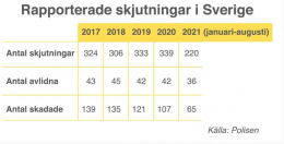 På begynnelsen av 2000-tallet lå Sverige på bunnen når det gjaldt dødelig skytevold i Europa. Siden 2018 har Sverige vært på toppen, ifølge Kriminalforebyggende råds siste studie . Totalt har det blitt rapportert mer enn 1500 skytinger i Sverige siden 2017.