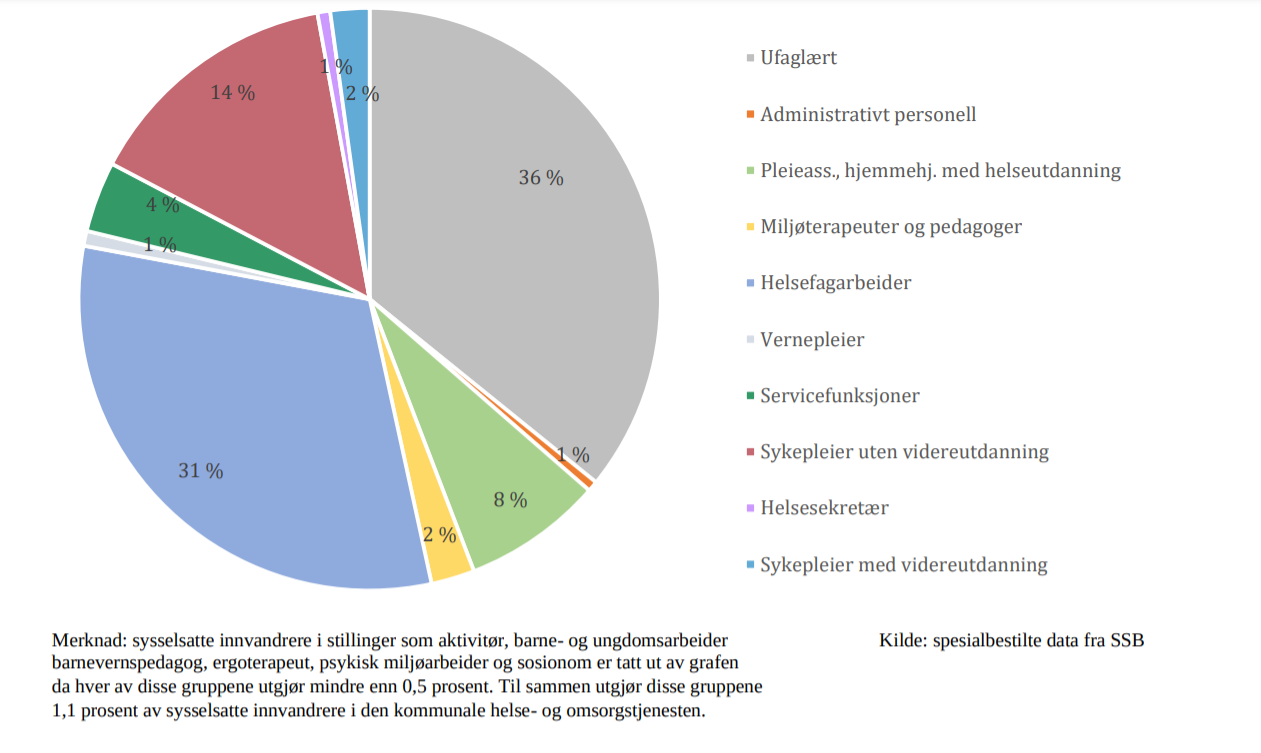 Nær 40.000 ansatte i kommunale helse- og omsorgstjenester har innvandringsbakgrunn. En stor andel av disse jobber nettopp som pleieassistenter og ufaglærte i hjemmetjenesten.
