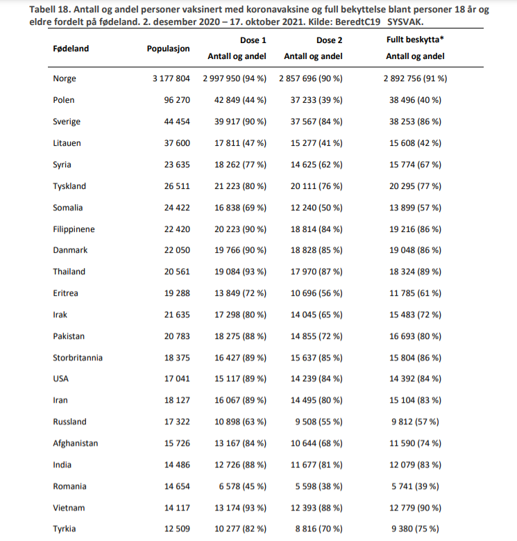 FHIs ukerapporter har gjennom pandemien vist at innvandrere som er født i Polen, Somalia, Pakistan og Irak er nasjonalitetene som har flest smittede, og de samme gruppene er også i FHIs seneste situasjonsrapport blant de som i minst grad er fullvaksinerte (selv om Pakistan er kommet opp i 80 % og Irak 72 %).